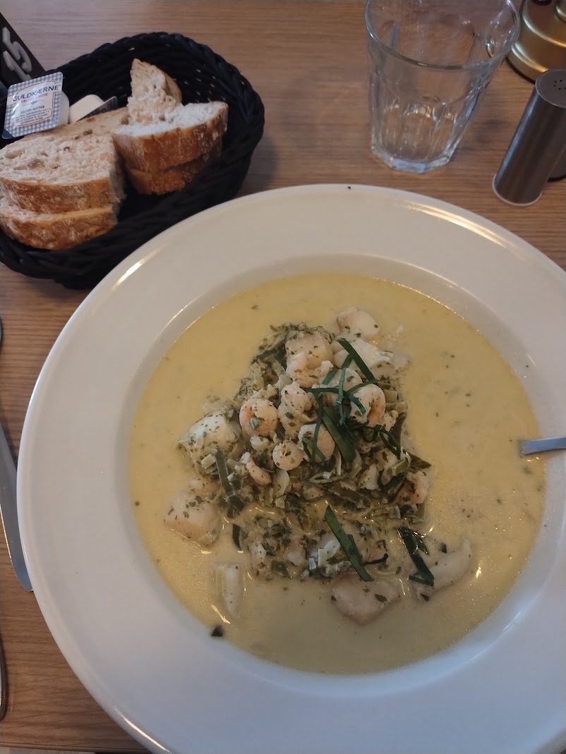 Finally, I tore myself away from watching the ice and had a real meal: creamy seafood soup with shrimp, scallops, and fish (the menu said salmon, but I think it was cod or char - not sure, but it was good!)